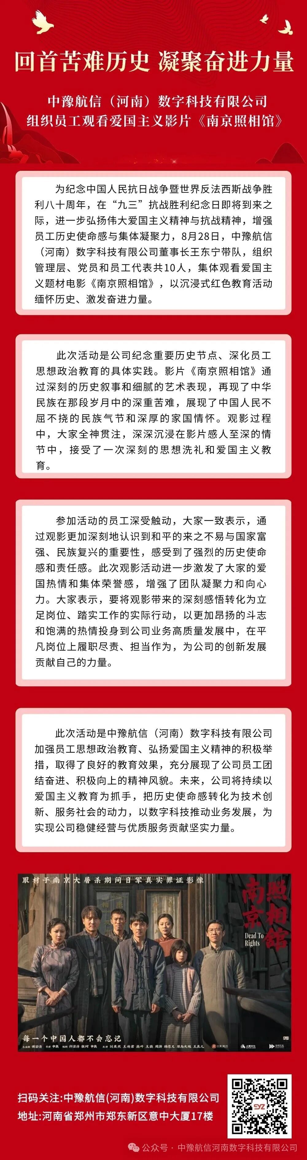 中豫航信组织员工观看爱国主义影片《南京照相馆》,回首苦难历史,凝聚奋进力量,厚植爱国情怀。
