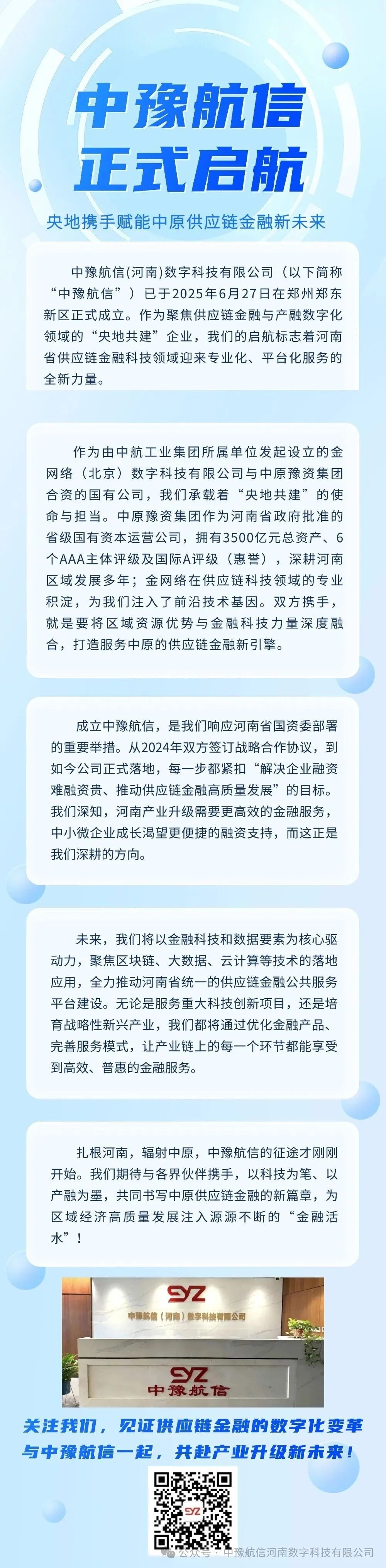 中豫航信(河南)数字科技有限公司正式启航,致力于以金融科技赋能中原供应链金融新未来,为区域经济发展注入新动能。