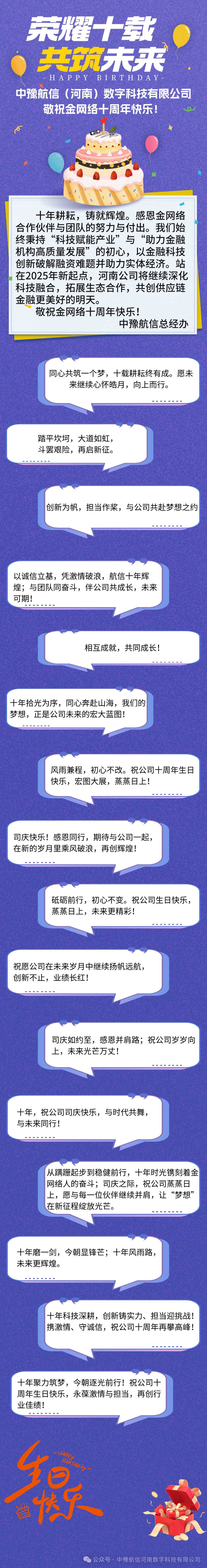 中豫航信敬祝金网络成立十周年快乐,感恩同行,共筑未来,携手开创更加美好的明天。